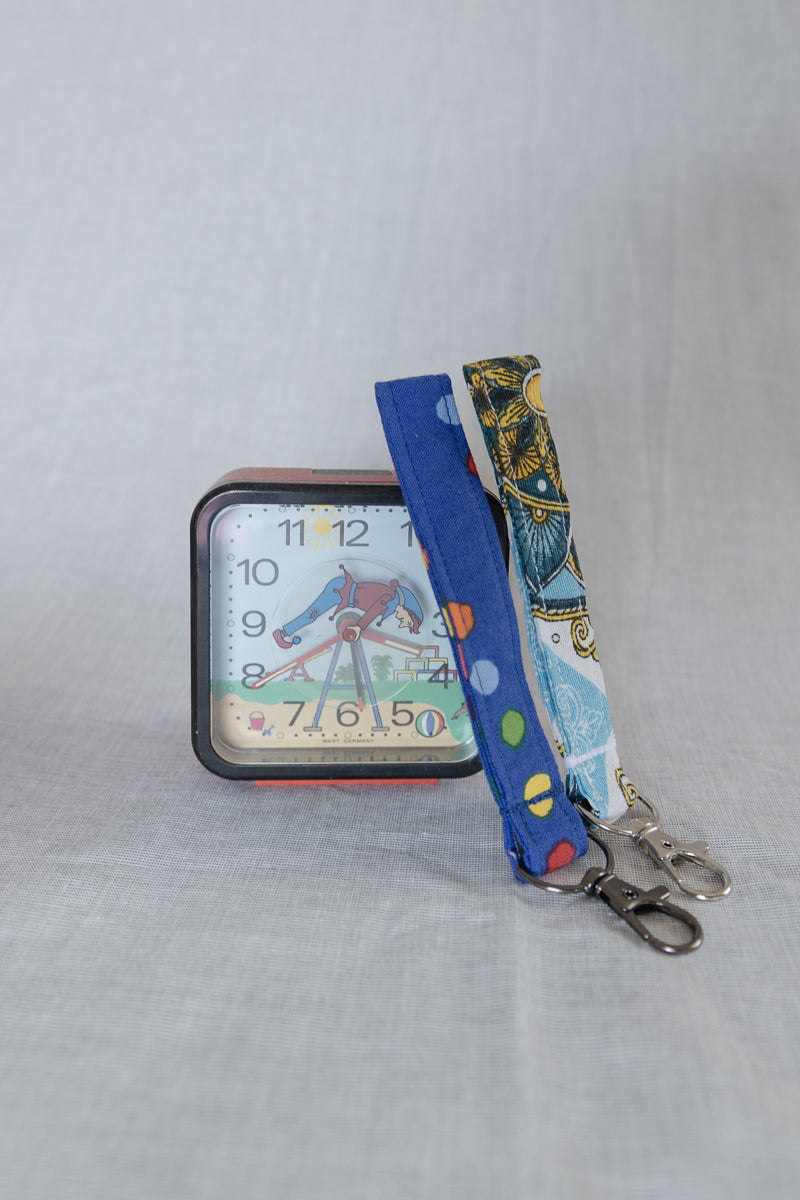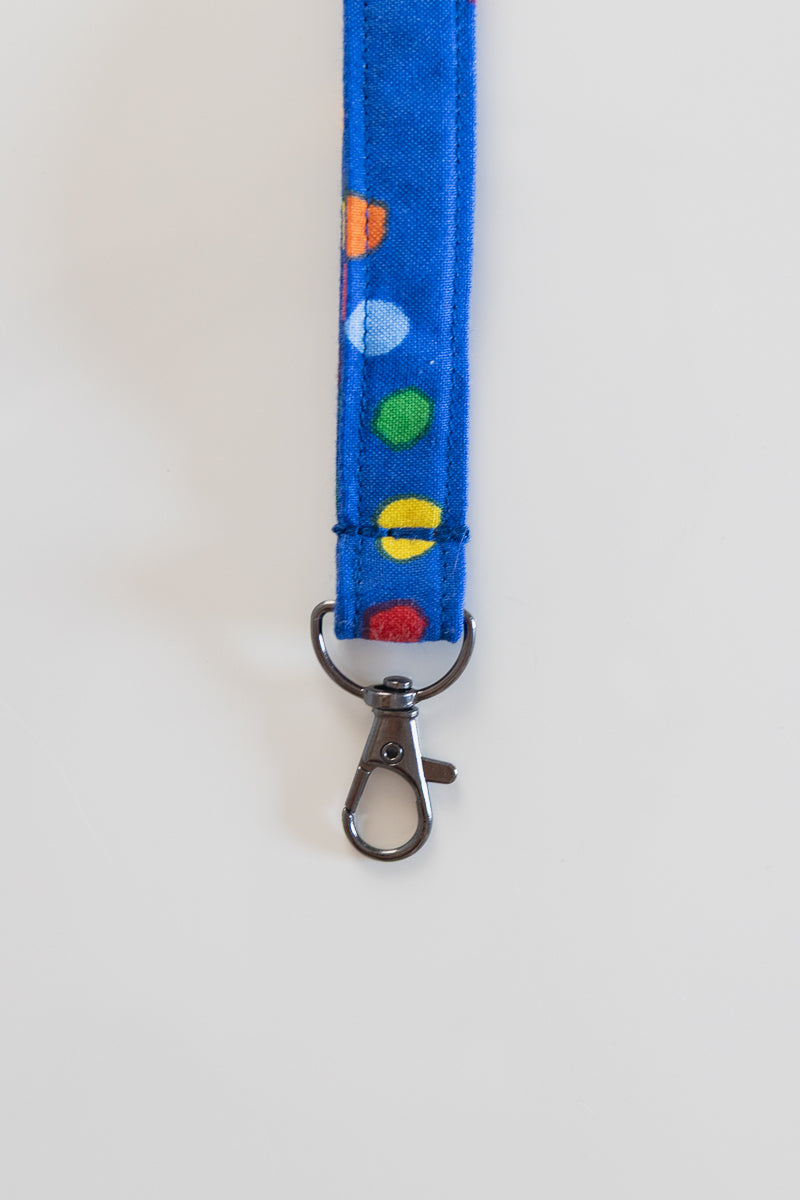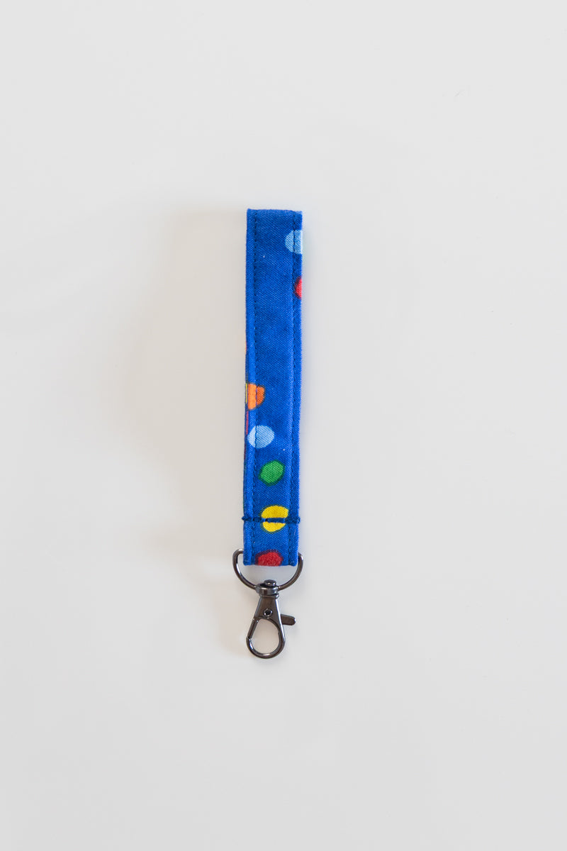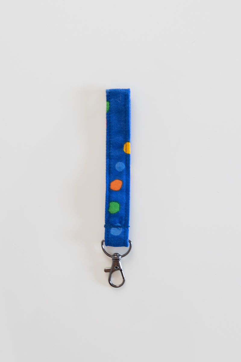 Portachiavi in tessuto di cotone blu a pois colorati.