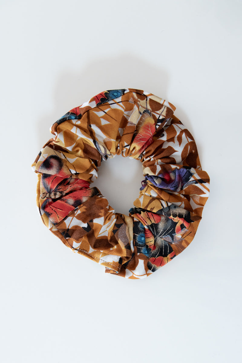 Splendido scrunchie realizzato a mano in un tessuto di cotone con stampa con farfalle.
