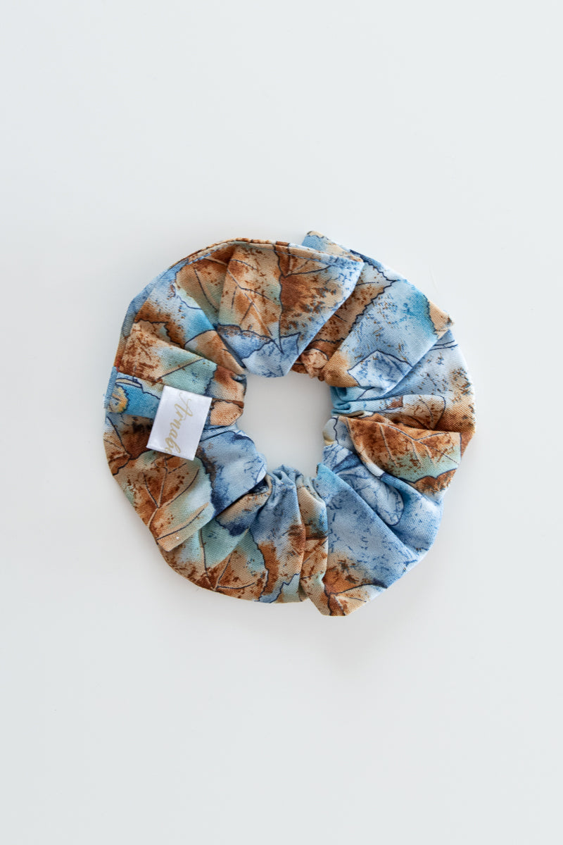 Splendido scrunchie realizzato a mano in un tessuto 100% cotone azzurro con foglie marroni, scrunchies autunnale.