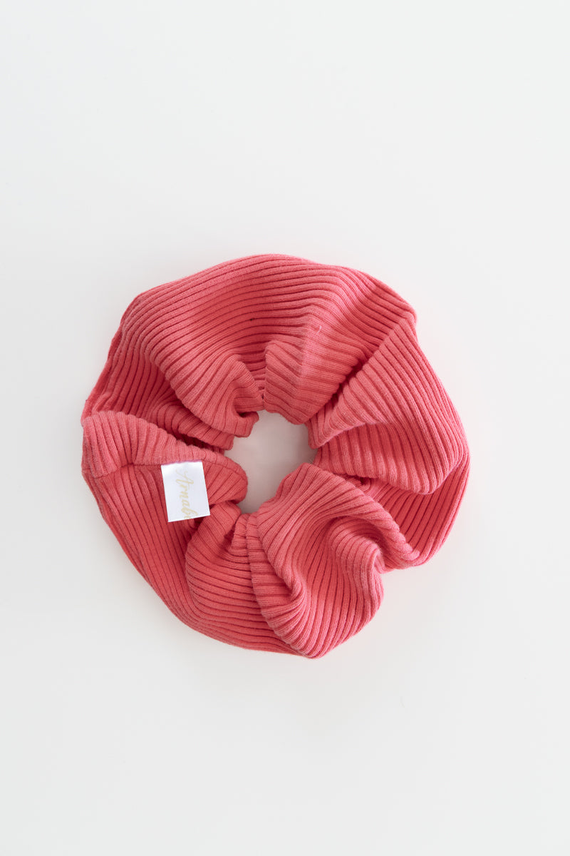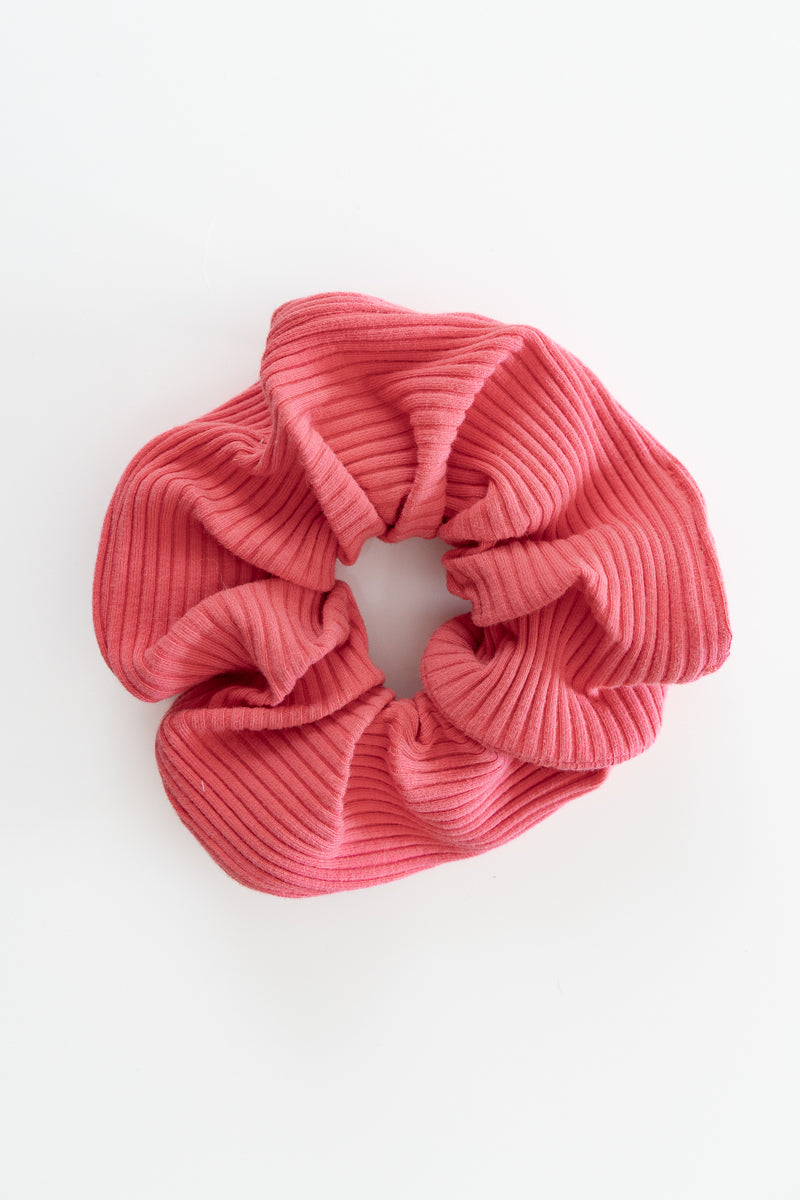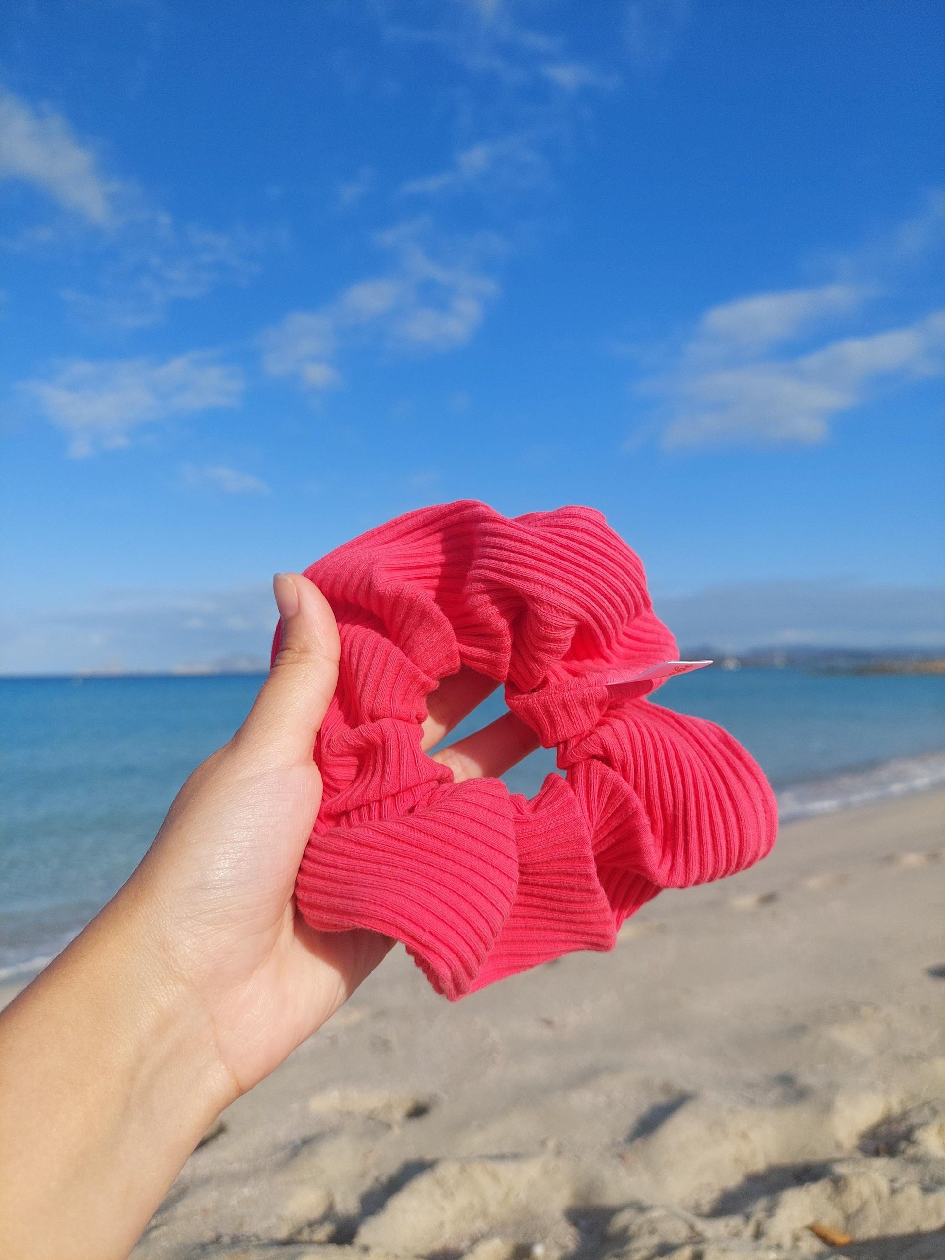 Splendido scrunchie realizzato a mano in un tessuto a maglia rib, tessuto maglione, in cotone e elastano in fucsia.
