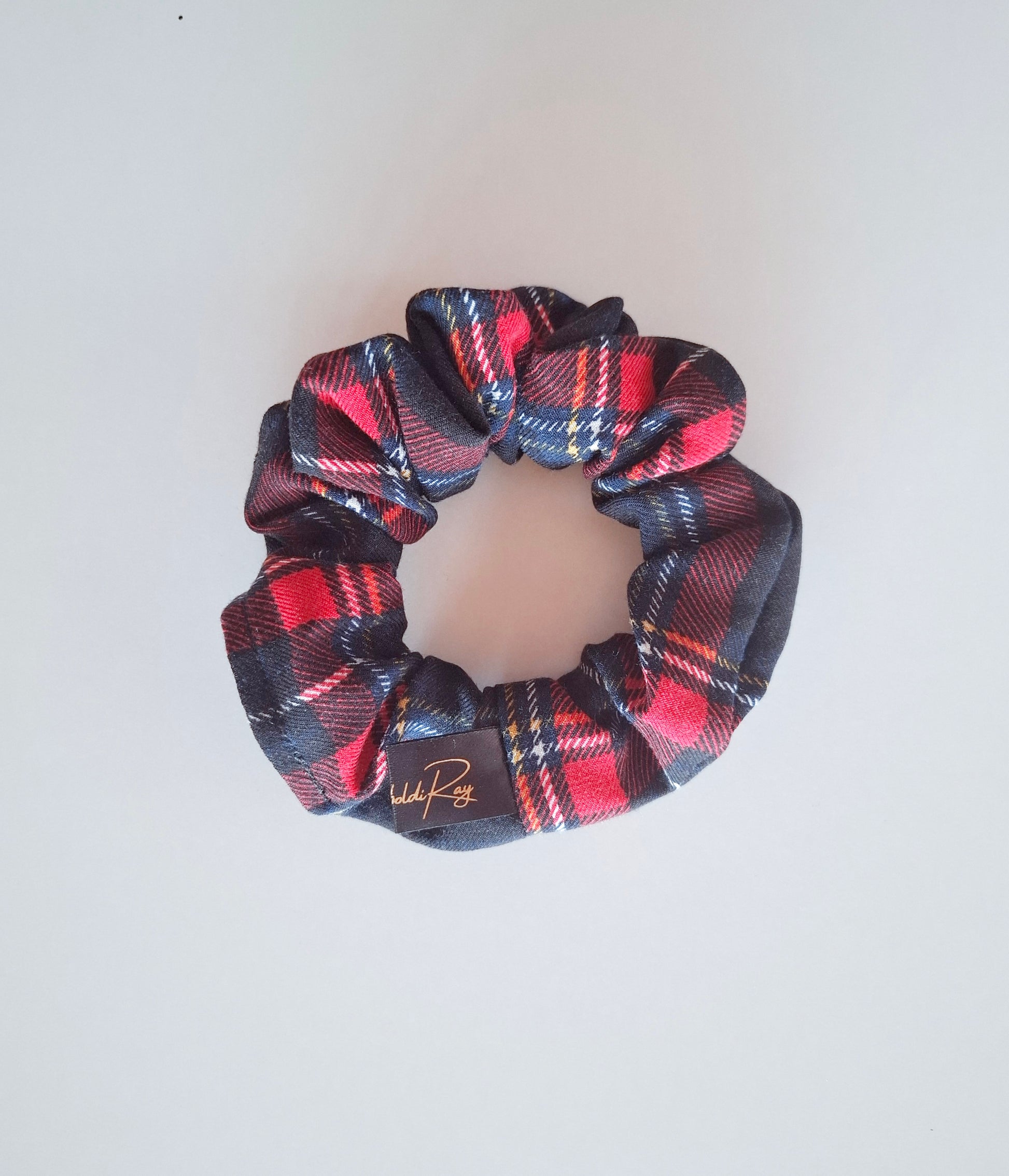 Splendido scrunchie realizzato a mano in un tessuto di cotone e poliestere tartan rosso e nero.
