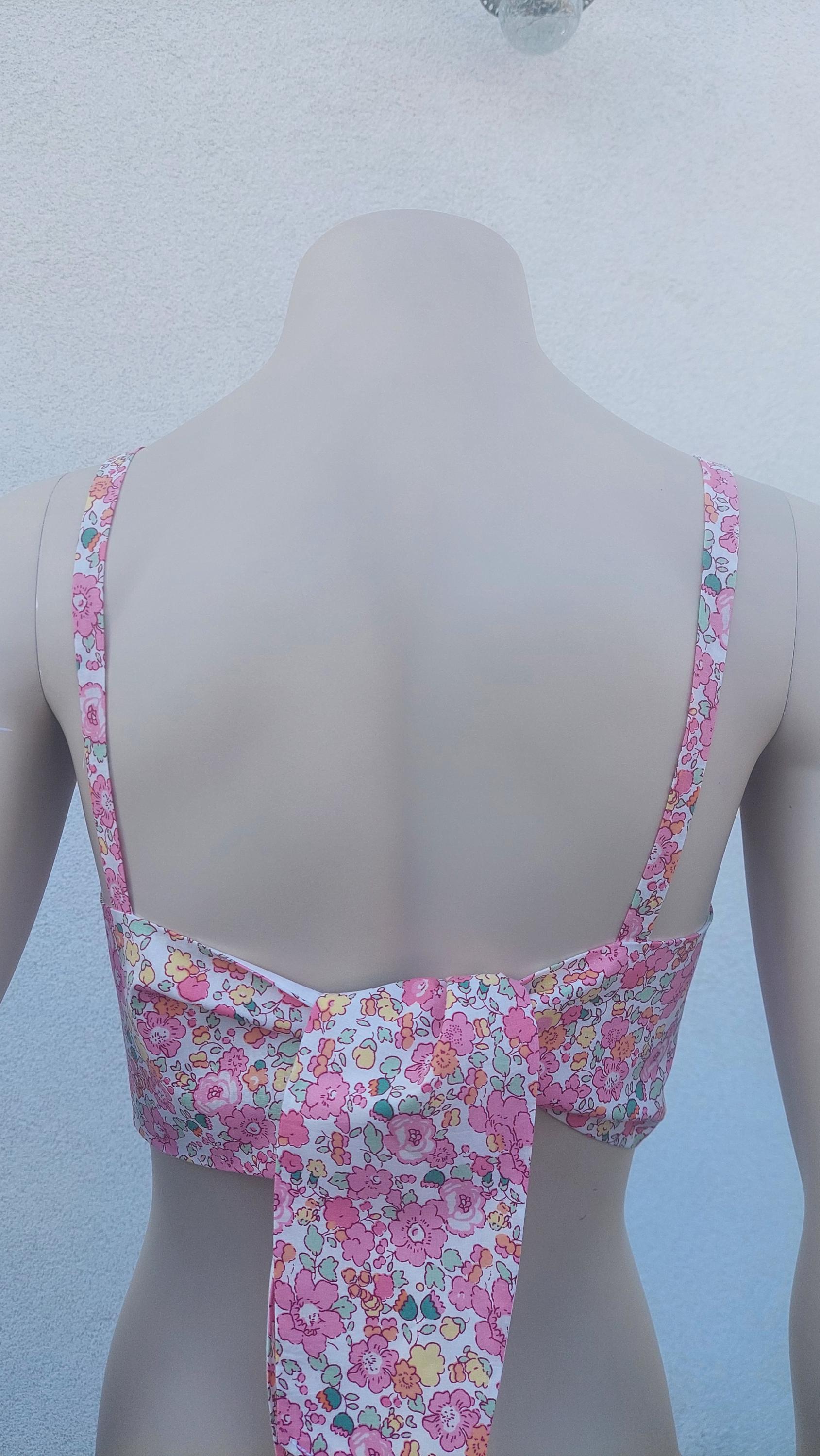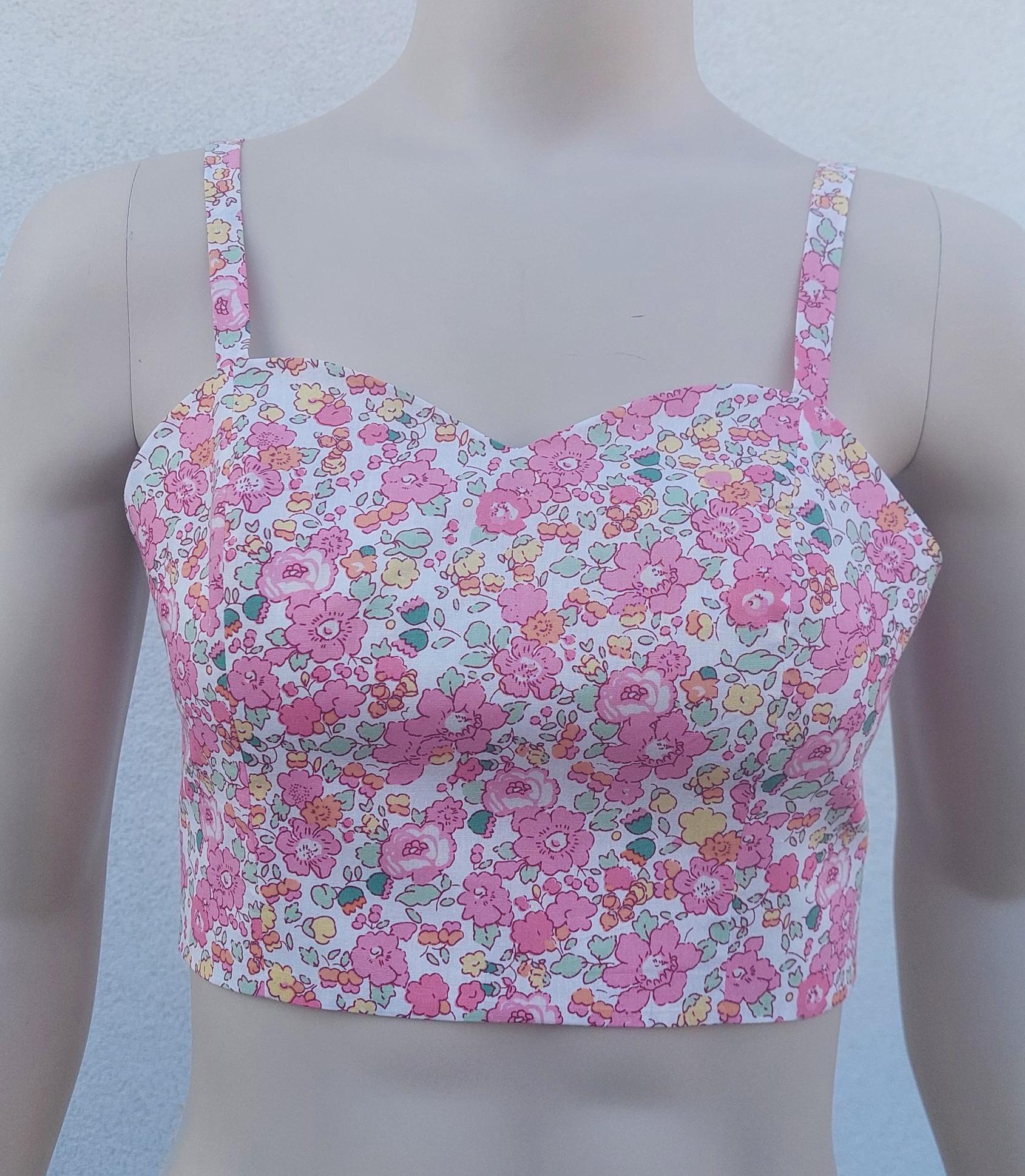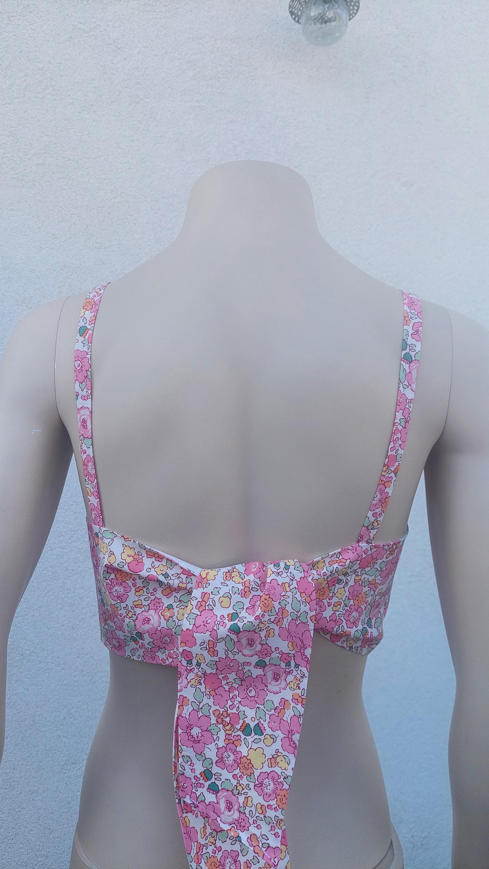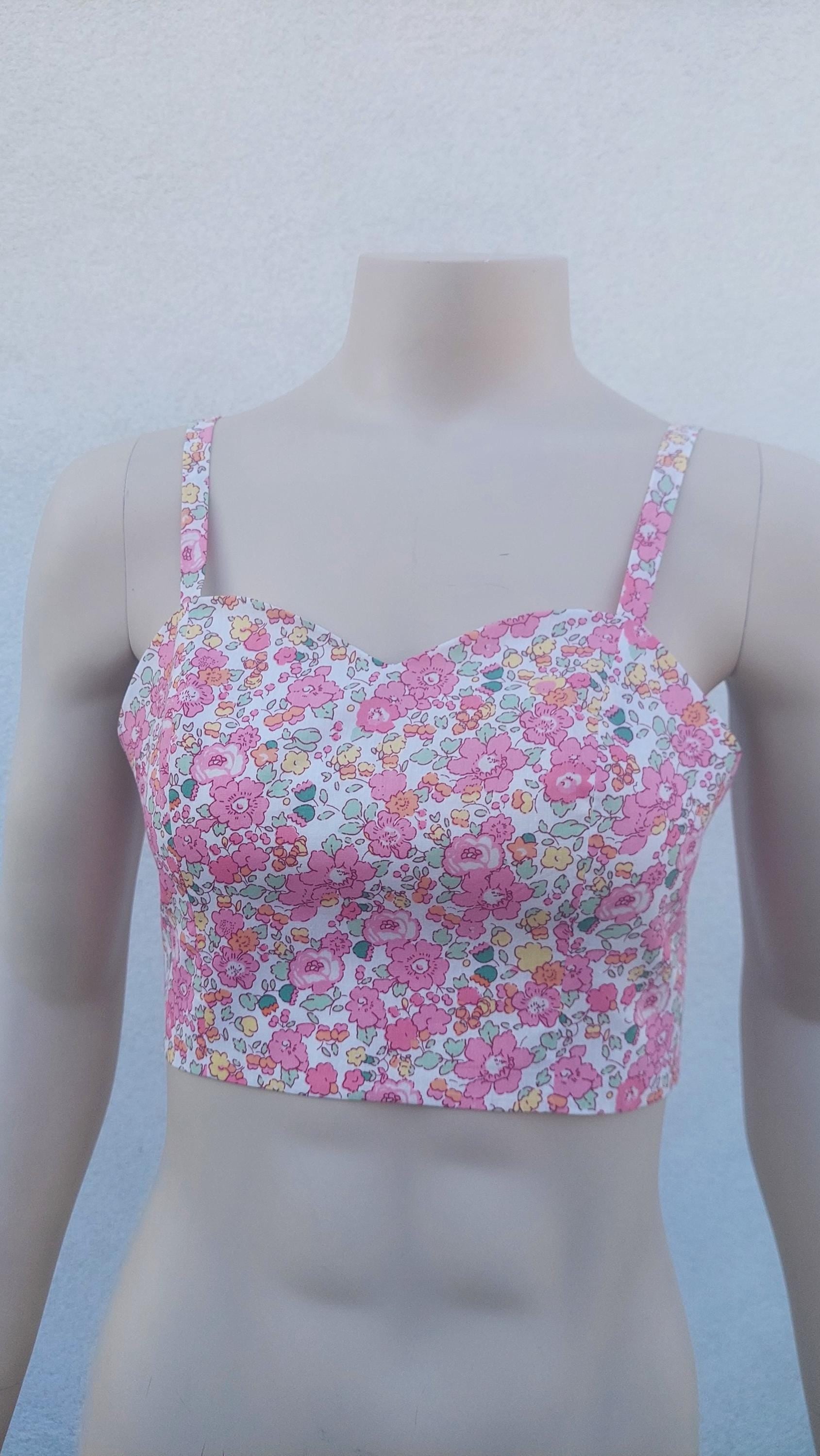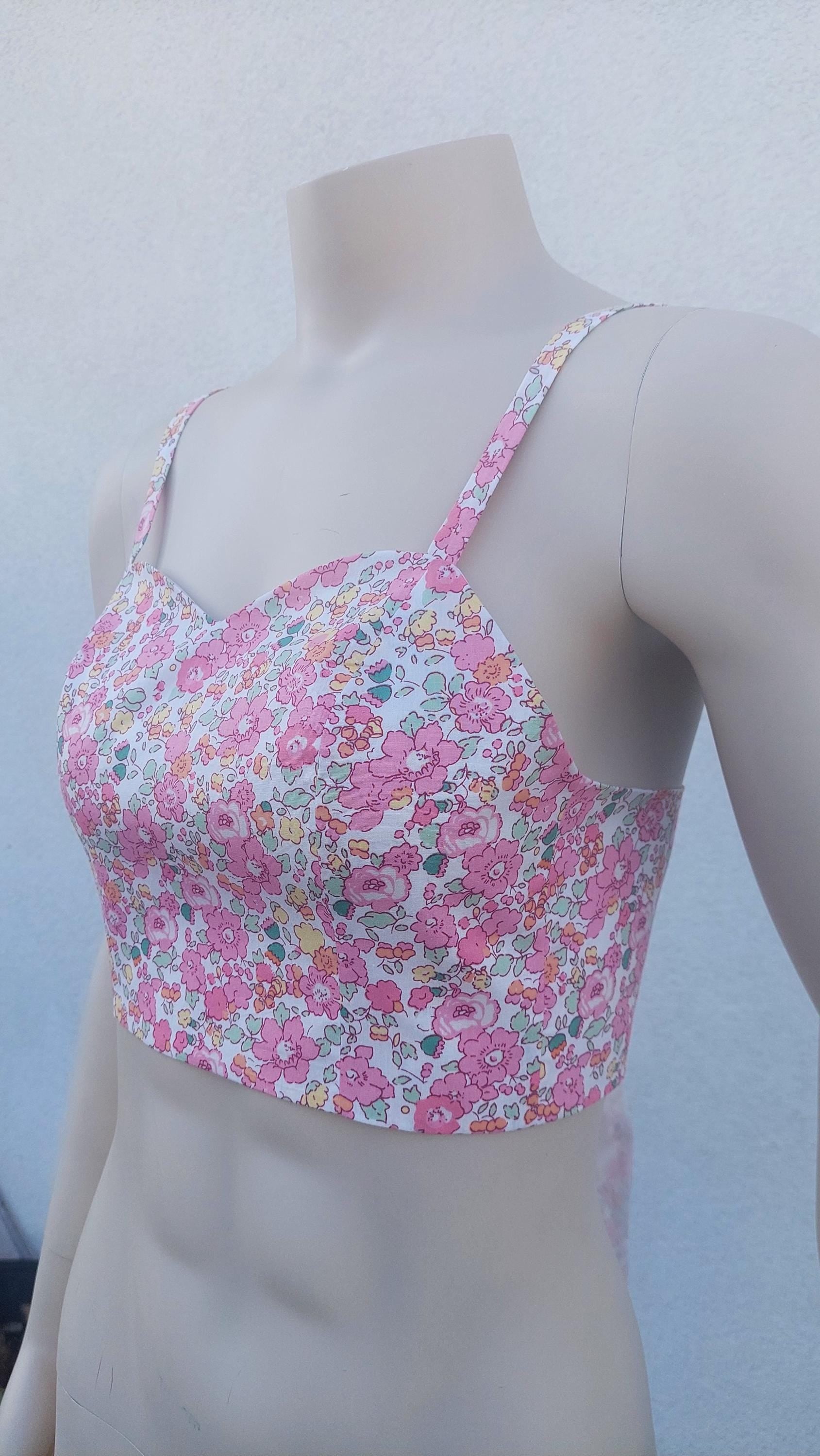 🌿 Sussurri floreali in cotone: realizzato in tessuto di cotone e poliestere bianco decorato con delicati fiori rosa, questo top è una ventata di aria fresca e di ispirazione vintage.