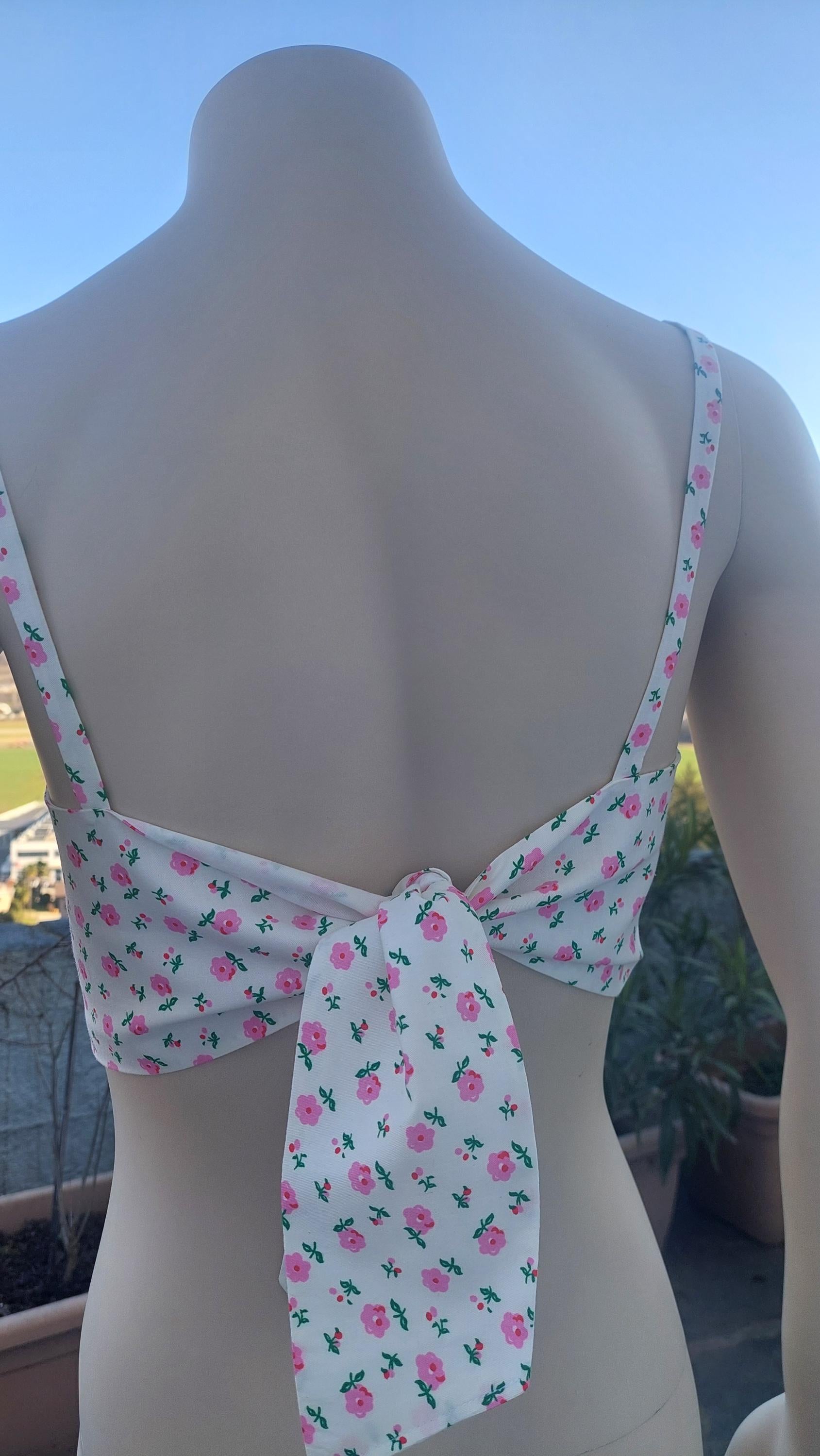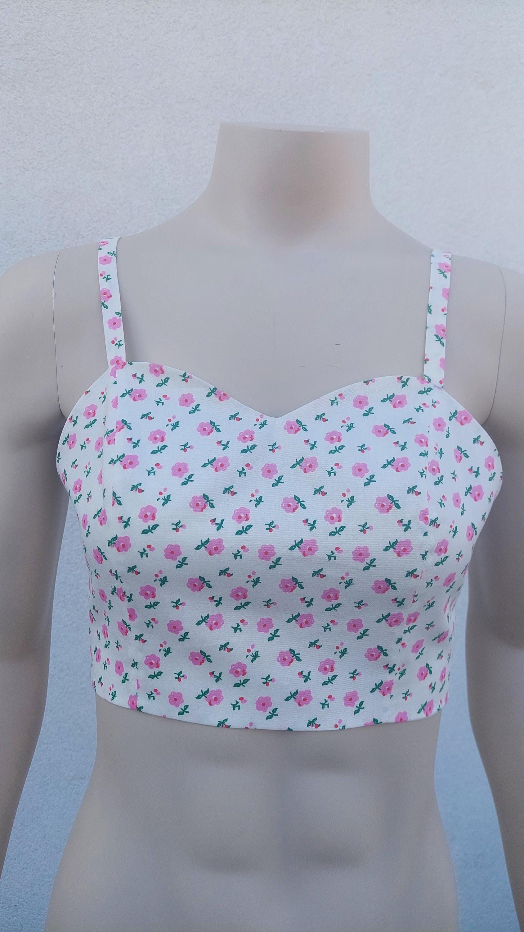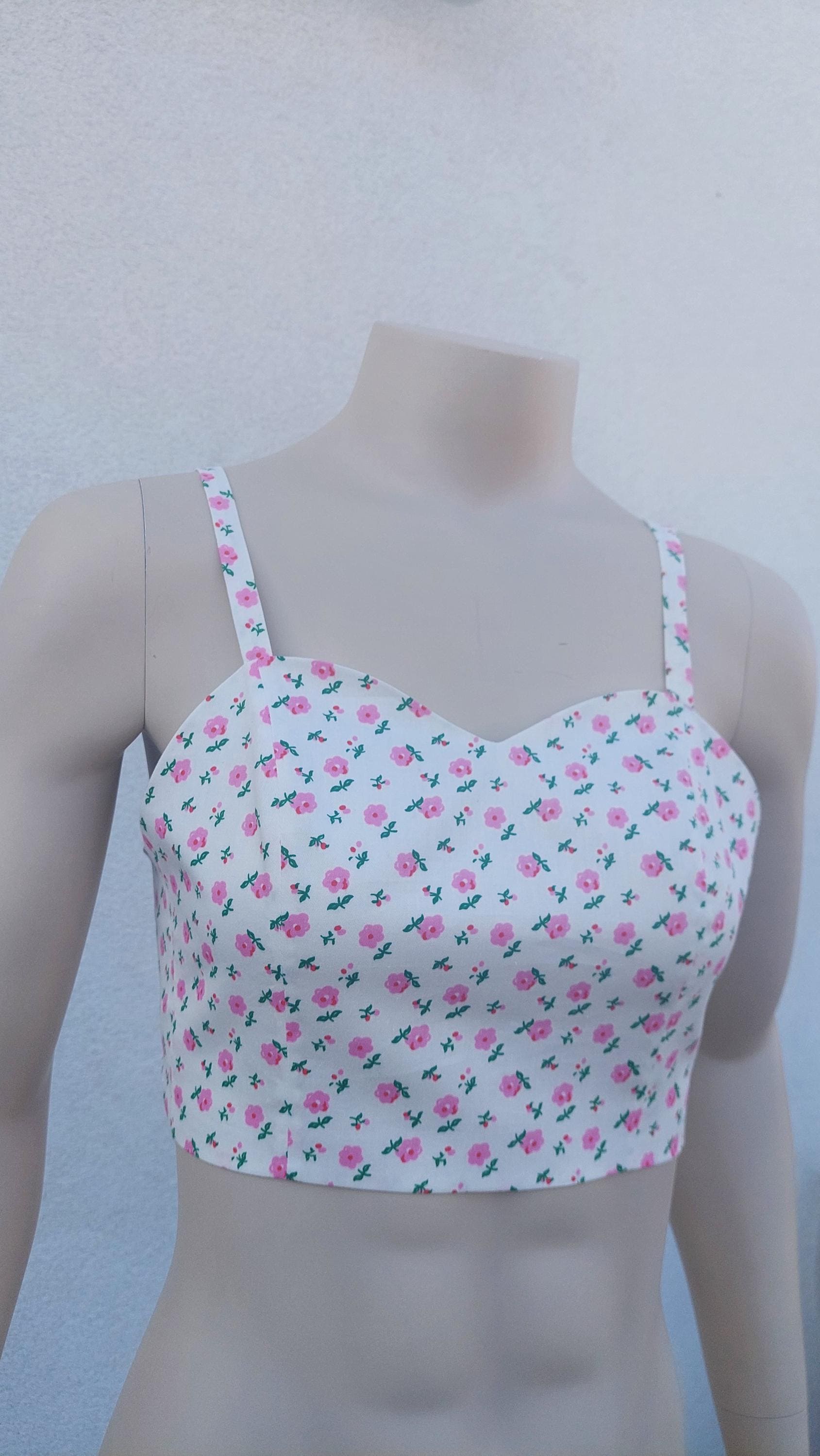 🌿 Sussurri floreali in cotone: realizzato in tessuto di cotone e poliestere bianco decorato con delicati fiori rosa, questo top è una ventata di aria fresca e di ispirazione vintage.